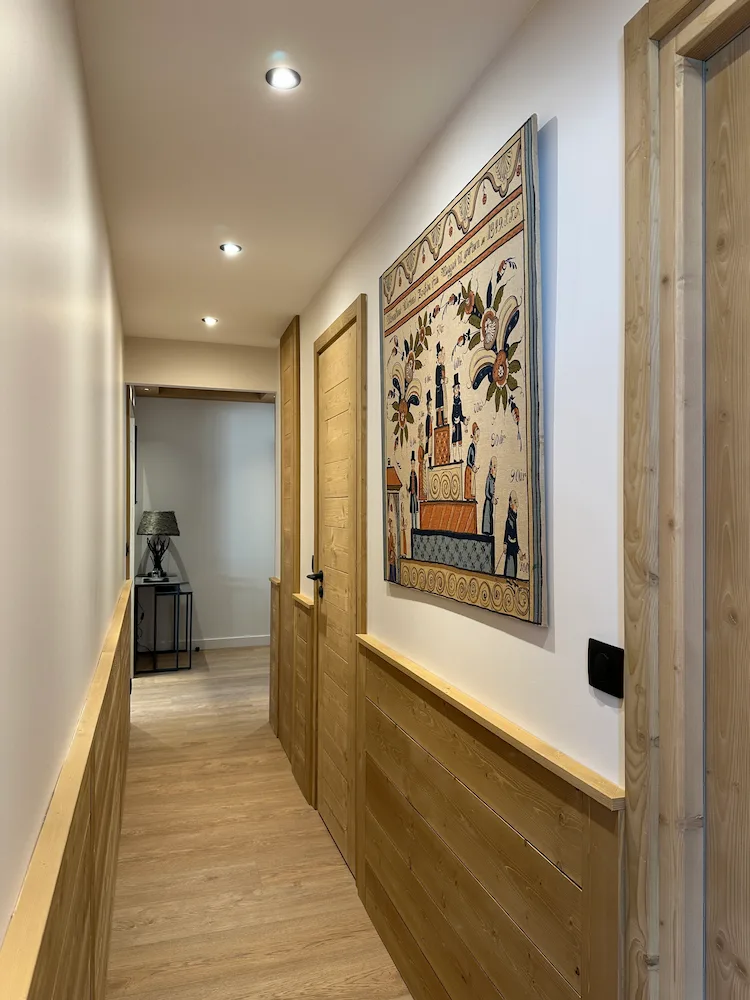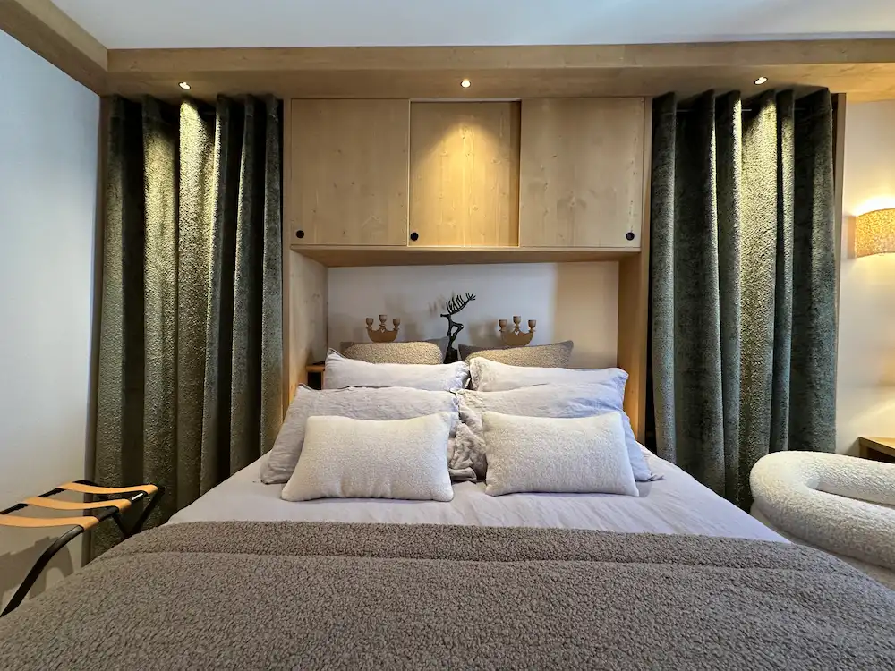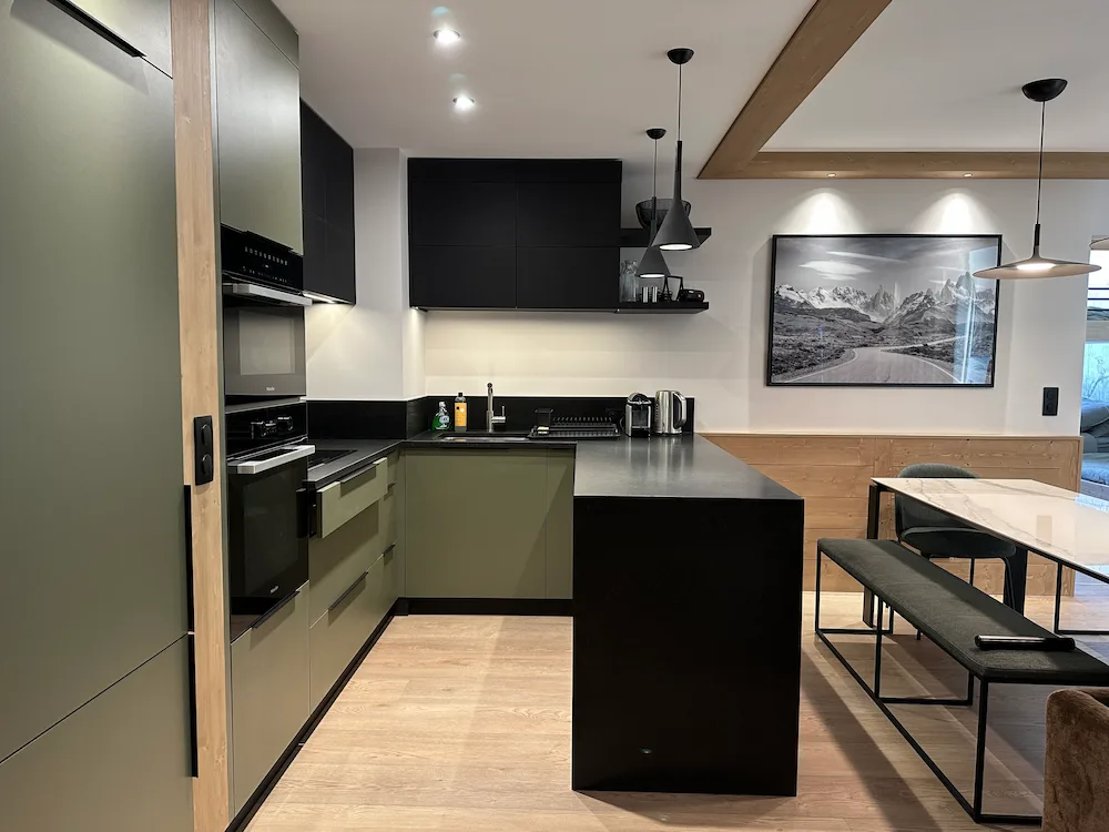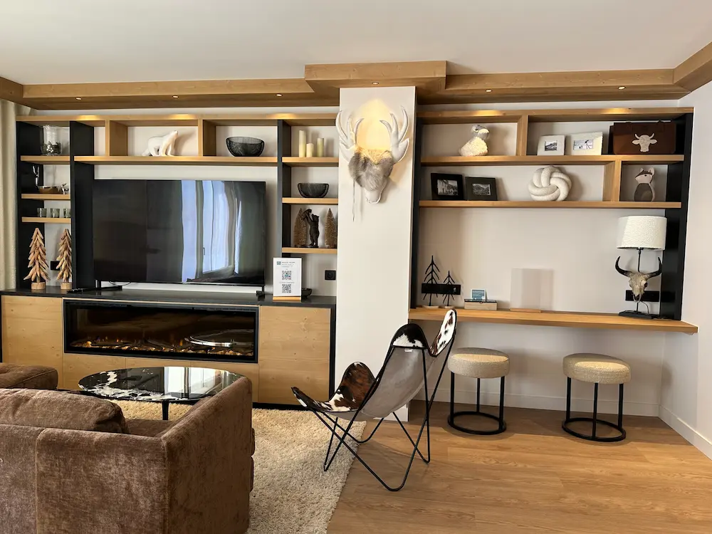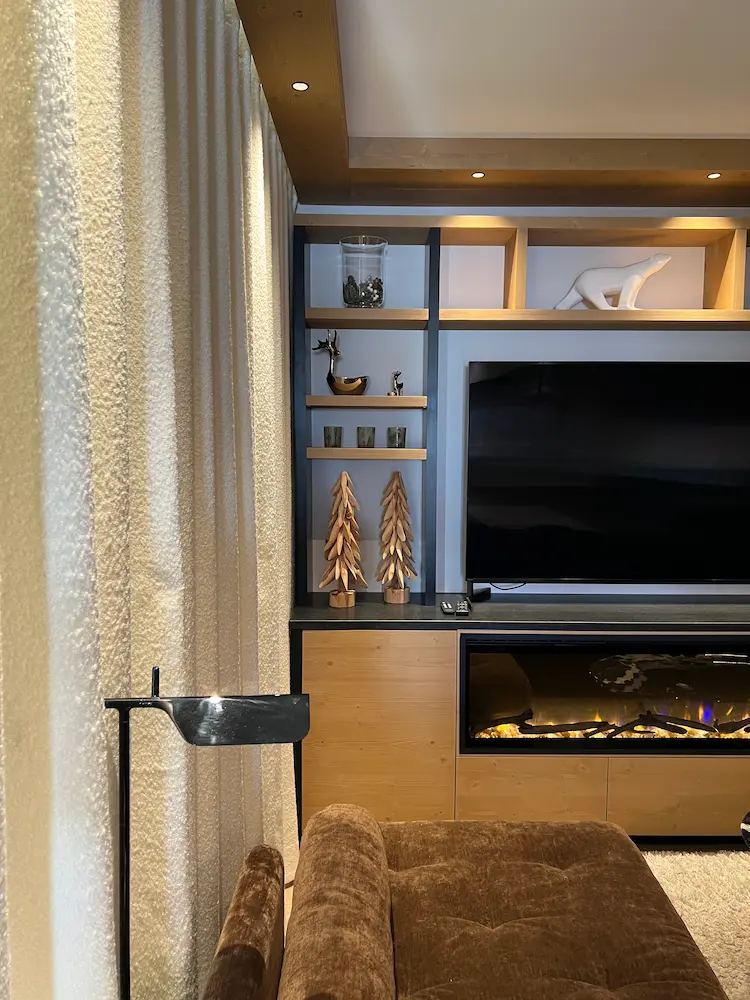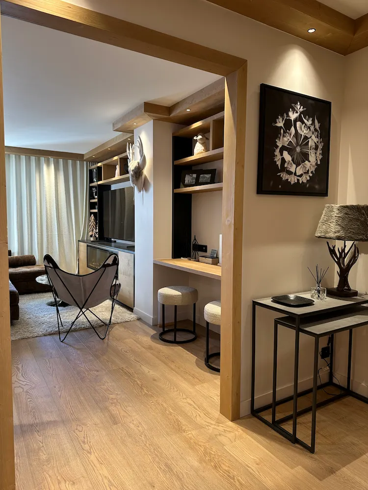 Le travail sur les éclairages indirects et les agencements bois structure l'espace, offrant une lecture sobre et haut de gamme de l'habitat de montagne.