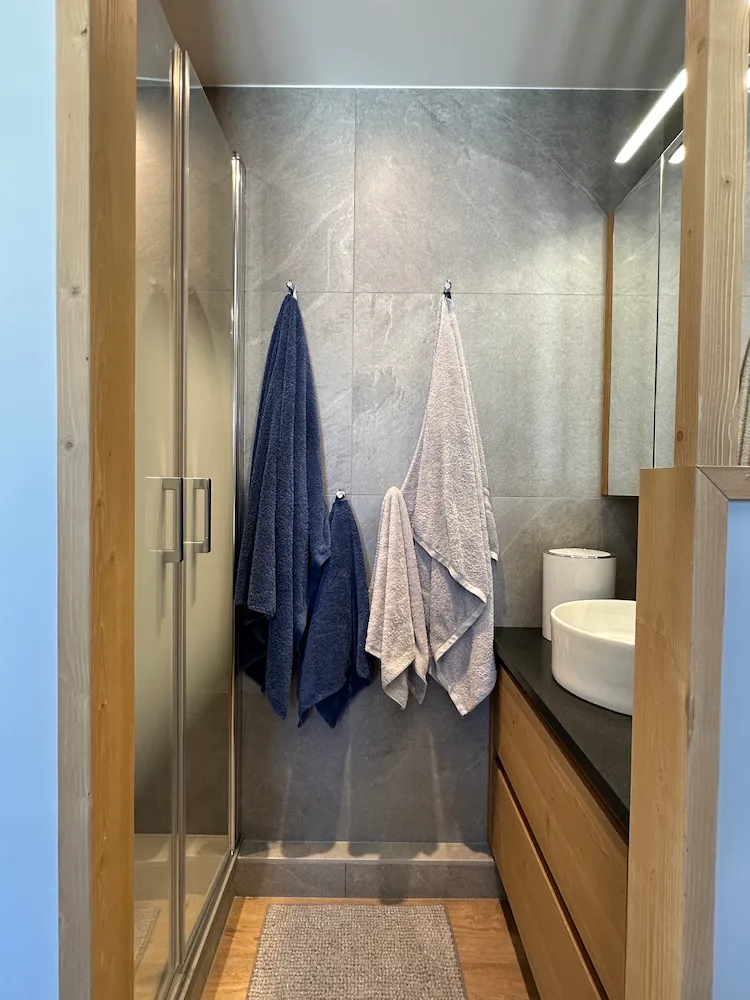 Dans chaque salle d'eau, le choix du chauffage mural a permis de libérer l'emprise au sol, optimisant ainsi l'implantation des équipements sanitaires sans compromis sur le bien-être.