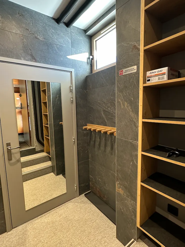 Pour répondre aux exigences d'un séjour à la montagne, le rez-de-chaussée accueille un skiroom optimisé. Conçu avec des matériaux résistants et des assises intégrées, cet espace facilite la transition entre les pistes et l'habitat.